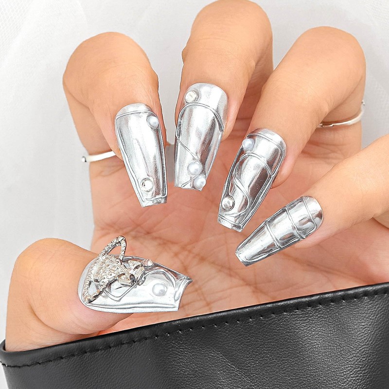 Sethexy Silver Long Ballerina Press On Nails Glitter Glossy Handmade Fake Nails 3D Pearl Metallic False Nails Salon Quality for Women and Girls 20PCS (C)