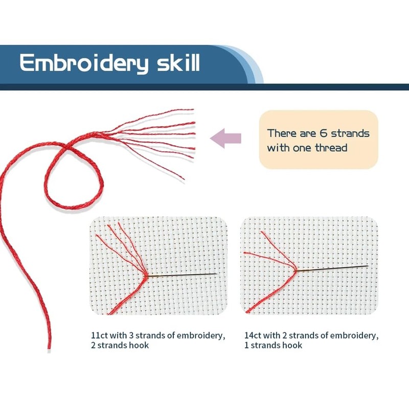 - ★【How many stands of threads should be used】This cross stitch design should be completed with 2-strands thread. Each line we provide is composed of 6 strands, so you need to divide the 6 strands into three 2-strand lines before you work.