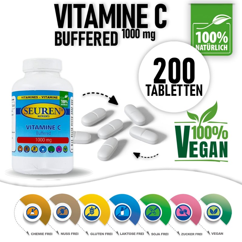 Seuren Nutrients | Vitamin C 1000 mg 200 Tabletten | Buffered C | Ester C| Gepuffert vitamin C | Glutenfrei | Laktosefrei | Zuckerfrei | 100% natürlich