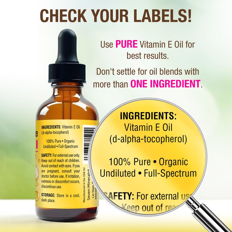 - ULTRA-PURE 75,000 IU per oz - You read that right. Our naturally occuring Vitamin E oil is the purest you can find. Unlike other brands that blend in cheaper carrier oils, we don’t cut corners. In every bottle of Seven Minerals Vitamin E Oil you’ll find just one ingredient. Pure, Organic, Full-Spectrum D-Alpha Tocopherol,Vitamin E.