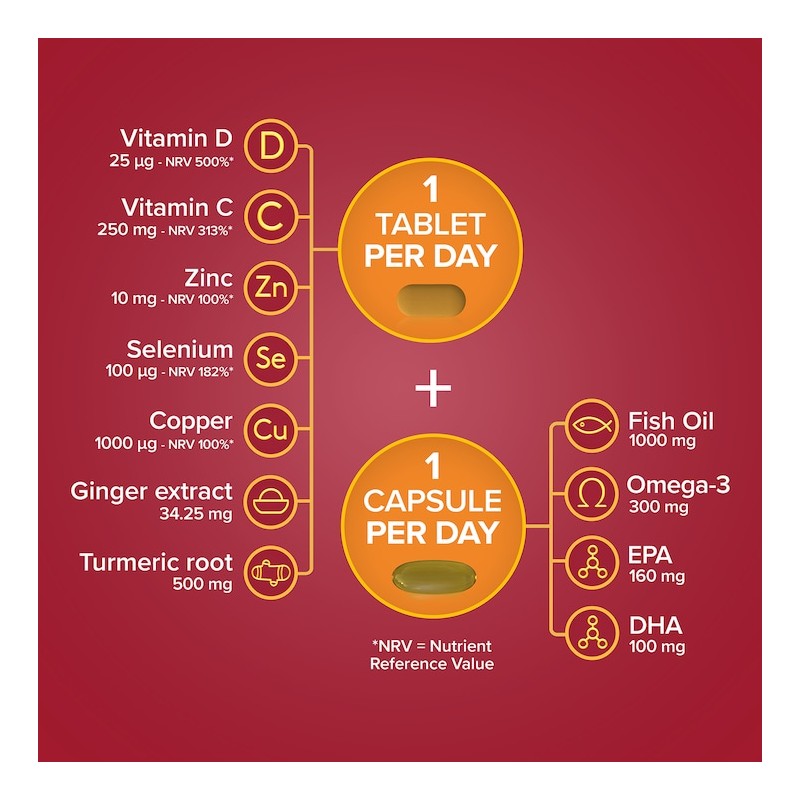 Take one Immune support tablet a day (orange blister packet) plus oneOmega-3Fish Oil capsule a day (red blister packet) with a glass of cold water. Store in a cool, dry place below 25°C.