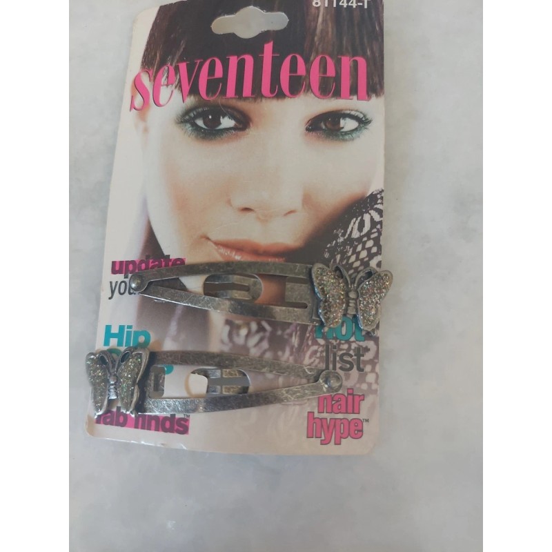 This vintage 1990's y2k SEVENTEEN hair clip barrette features a glitter butterfly design, perfect for adding a touch of 90s style to your outfit. The silver barrette is made of various materials and is suitable for all hair types, especially long hair. With its eco-friendly features and retro theme, this unworn barrette is a unique accessory for travel or casual occasions, showcasing the brand's distinctive style. Ideal for women looking to add a pop of nostalgia to their look.
