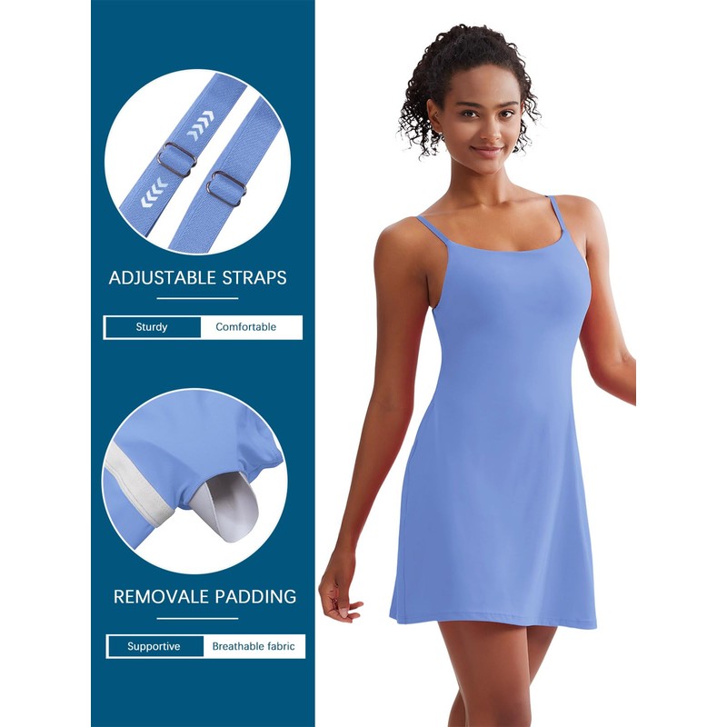- 2 In 1 Tennis Dress:Workout dress with built-in shorts & removable bra for a total coverage and ease of movement,With safety shorts inside to prevent see-through,so you can be confident when doing every workout.Plus,two side pockets are added in undershorts are great for keeping your essentials within reach.