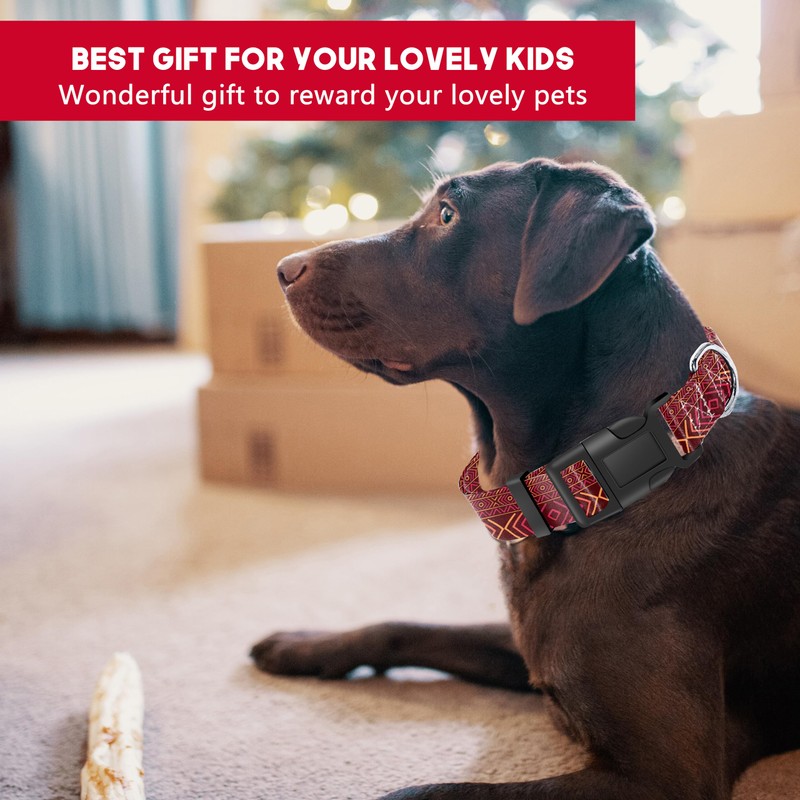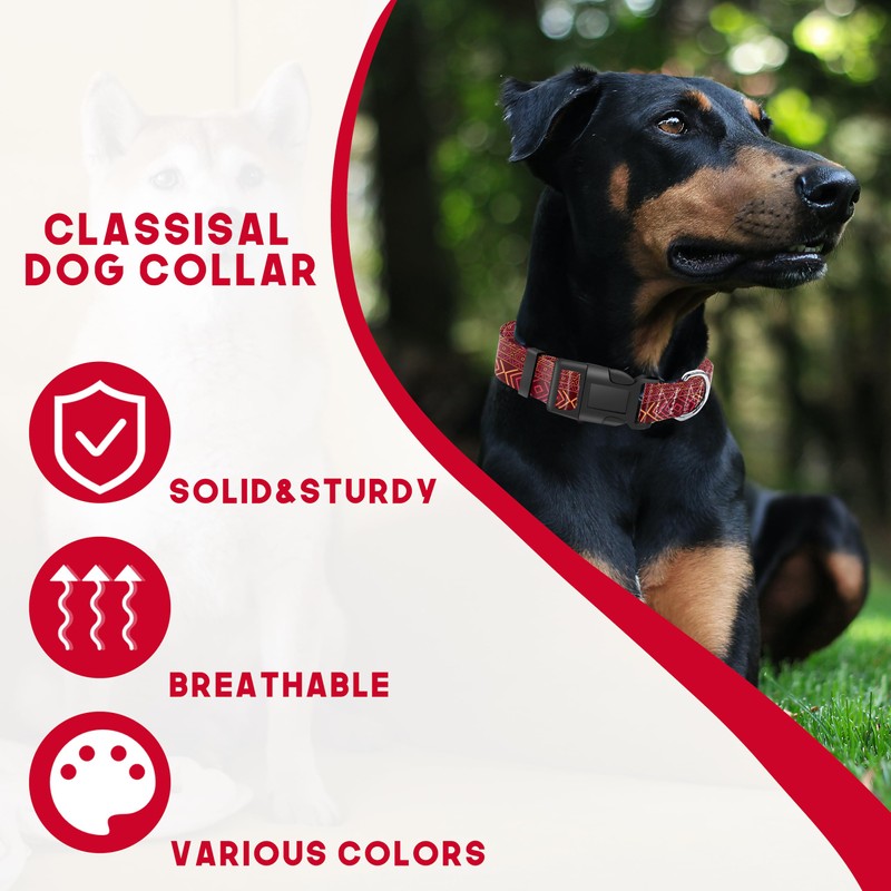 • 🎈[DESIGN FEATURE]💕 The designed nylon dog collar will make your dog look stylish and handsome when walking outsides. Quick release buckle will not get stuck in your dog’s neck, preventing choke and entanglement. The moveable buckle make you flexibly adjust the length to a perfect fit. You can also attach a matching leash to the metal D ring.