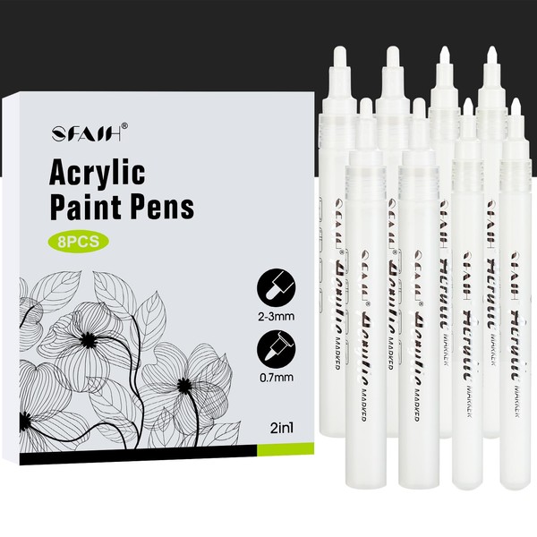 SFAIH White Paint Markers Paint Pens - 8 Pack Acrylic Permanent Marker for Rock Painting, Wood, Metal, Fabric, Plastic, Canvas, Glass, Ceramic, Art Projects, 2-3MM Medium Tip & 0.7mm Extra Fine Tip
