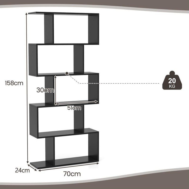Elegant s-shaped bookshelf with 5-tier large storage space can make the most of vertical space.