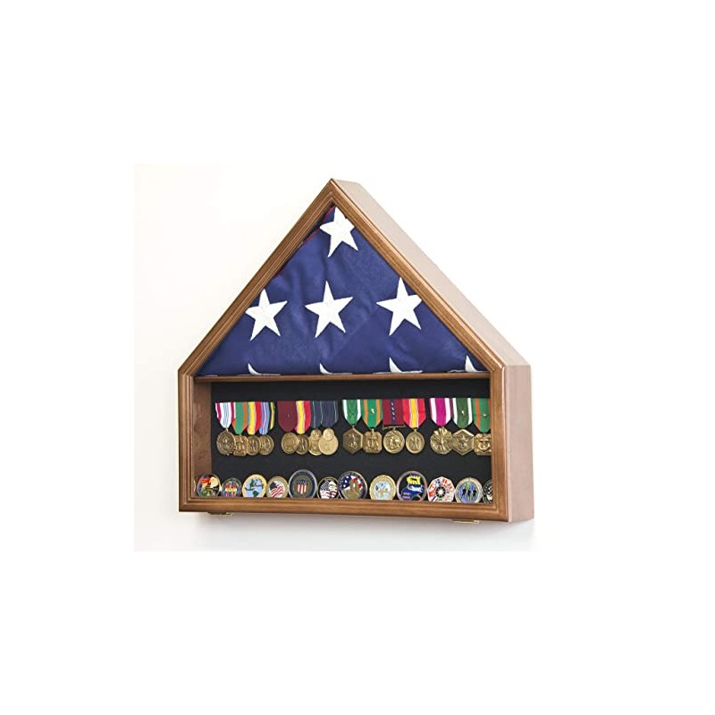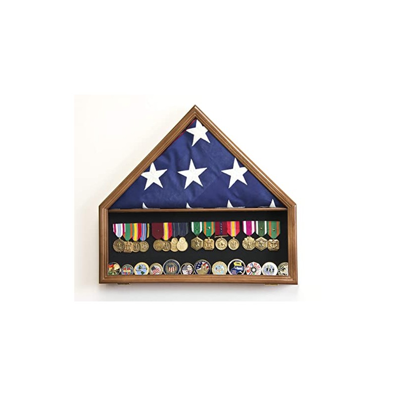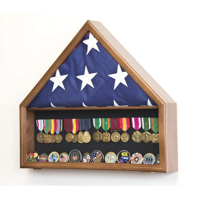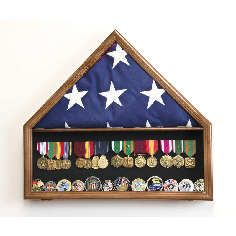 Velcro friendly and pin-able background for easy mounting of memorabilia. Bottom shelf is slotted for challenge coins. Use this popular display to combine a flag and challenge coins, military lapel pins, medals, buttons, shells, ribbons, patches, badges, insignia, and other memorabilia!! Display case accommodates a standard size 3' x 5' or 4' x 6' flag