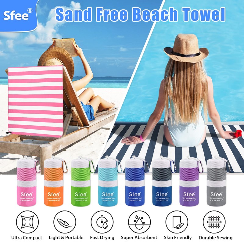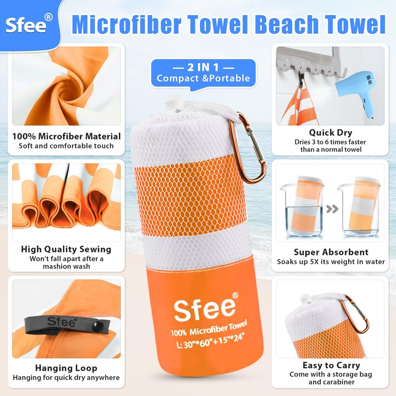 • Easy to Carry & Lightweight: Sfee quick dry beach towel made to save the space and to be more useful for traveling, professional travel, outdoor and beach side use. Our lightweight towel for travel are super space saving and easy to stuff it into your suitcase or backpack. Camping towel sets come with hanging loop for easy to carry. It is convenient hanging for quick dry anywhere without blew away.