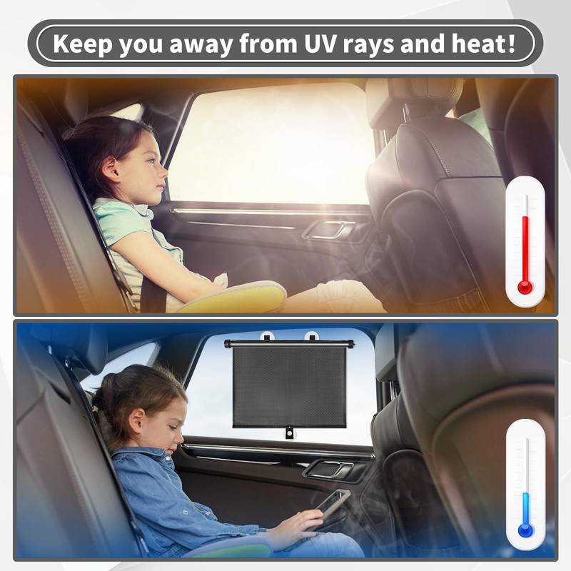 - Fit Most Car Windows: The size of car sun shade is 15.7"×17.7". Whether you own a sedan, truck, SUV, full-size cars, medium-sized family car, a minivan, or even a van, the size perfect fit for your car windows. This roller window shades for car has an exceptional configuration, fit universal car side and rear window. It can be effectively used with most window sizes and still offer full protection. Say goodbye to harmful UV rays and glare. Keep your car cool and comfortable.