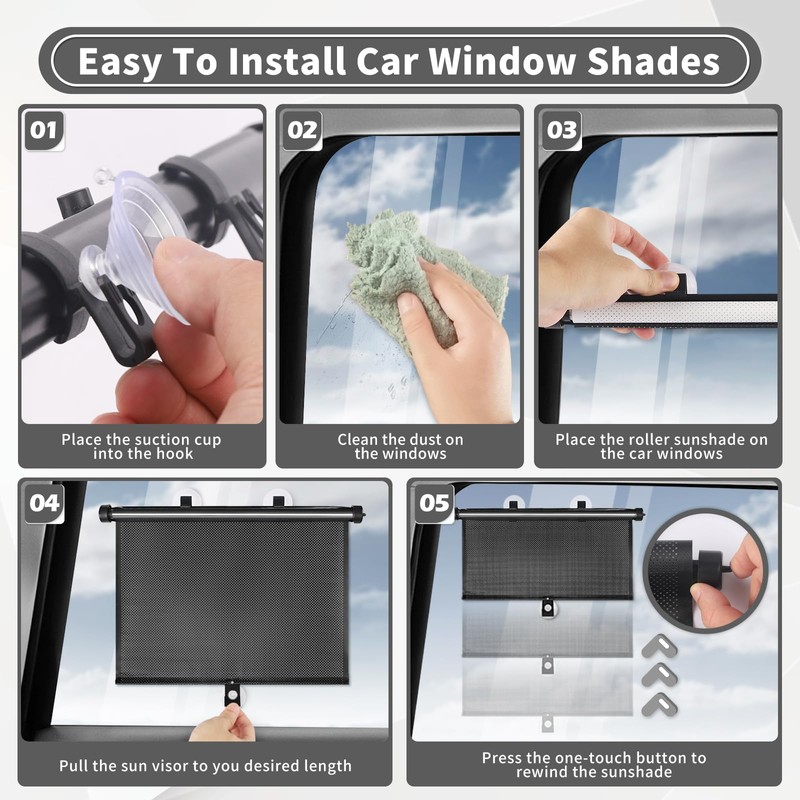 - 2 Pack Attachment Car Window Shades:Sfee window shades for car comes with 6 rubber suction cups which keeps your car sunshade strongly attached to the window. The set of 2 retractable car shade are especially important when you are carrying an infant in your back seat. The car sun shade has two attachment ways, the adjustable clips or suction cups. The car roller sunshade can be increased or decreased in height to provide the perfect fitting for most windows and keep the shade securely in place.