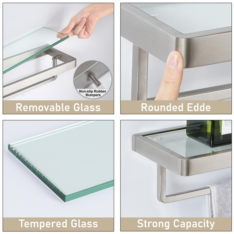SFGSOWOR Glass Shelves/Shelf Wall Mount 20-in with Towel Bar/Rack Floating Shelves for Bathroom Tempered Glass Rectangular 1 Tier Organizer Wall Shelf (Brushed Nickel, 20'')