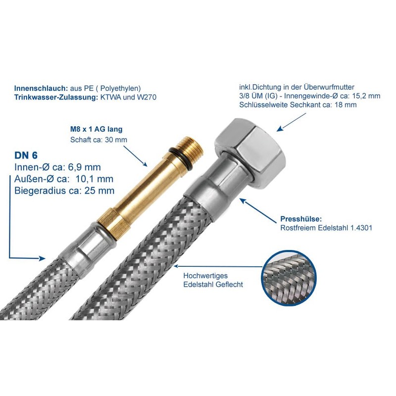 The special feature of this flexible connection hose 3/8 inch is the long M8x1 male connector. So you can connect to the angle valve via the 8 mm threaded fitting. For use in the food industry and also in the sanitary sector, it is important that this is a stainless steel reinforced hose for drinking water. The use of the flexible stainless steel hose as a drinking water hose is still certified by the test KTW-A and W270. Another advantage is the stainless steel mesh, which makes the reinforced hose DN8 also usable as a safety pressure hose.