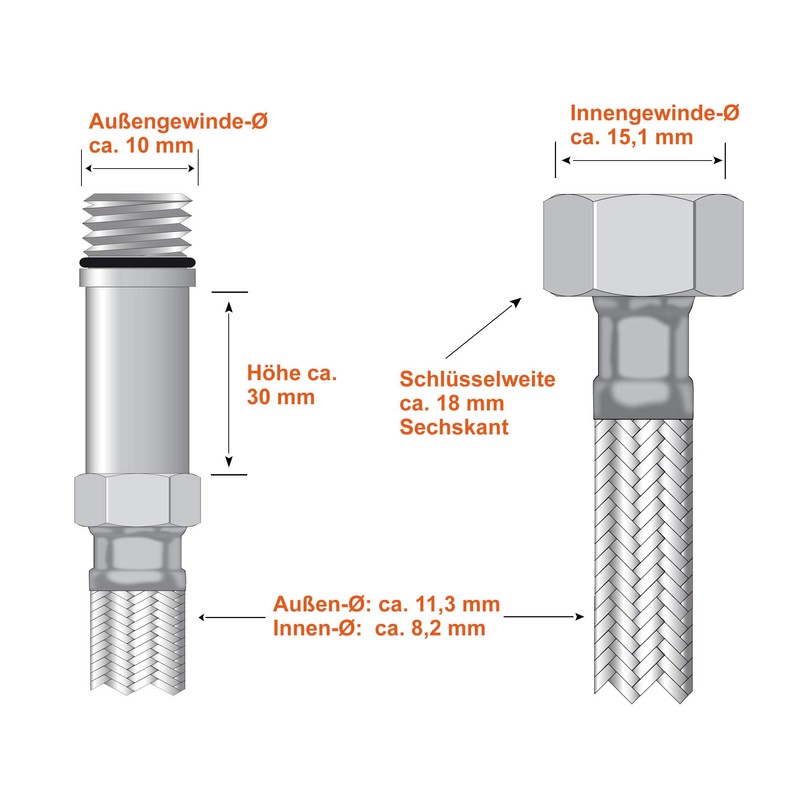 - Drinking water hose DN8 flexible water pipe with stainless steel mesh 1.4301 - includes seals