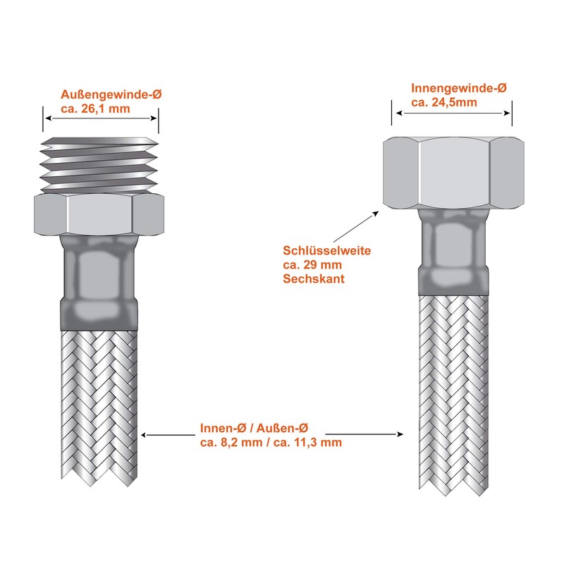 Special attention should also be paid to the braid made of 1.4301 stainless steel. The stainless steel washing machine hose extension is protected by the rust-proof stainless steel for humidity, water and light acids. The flexible hose DN8 can also be used as a tap extension.