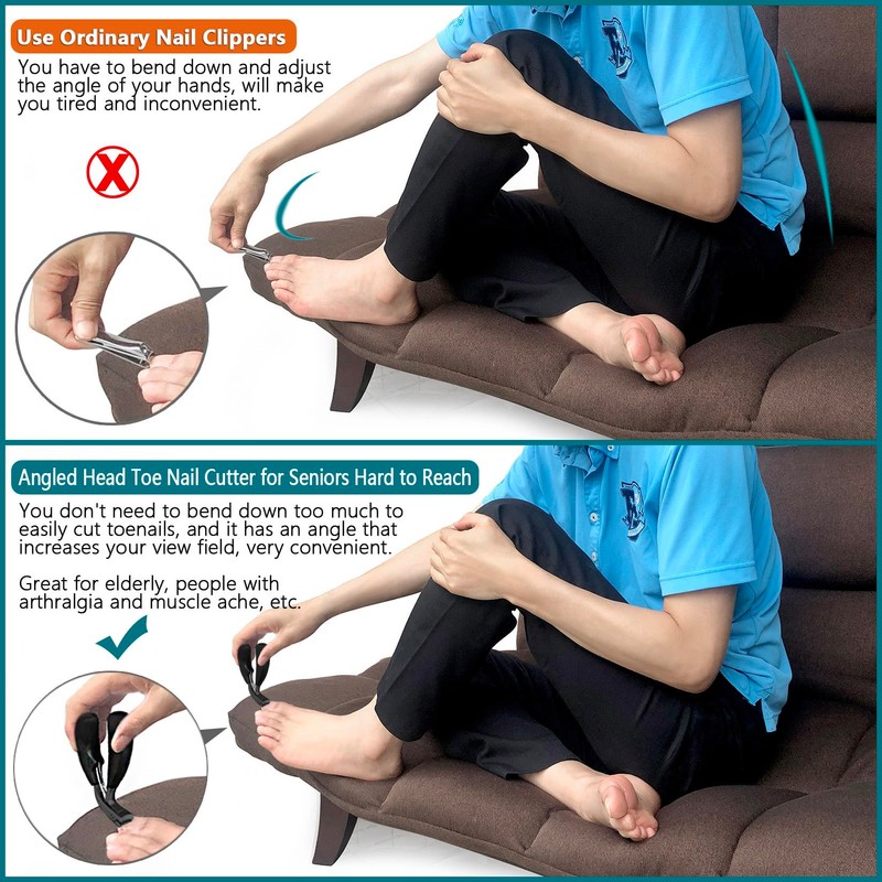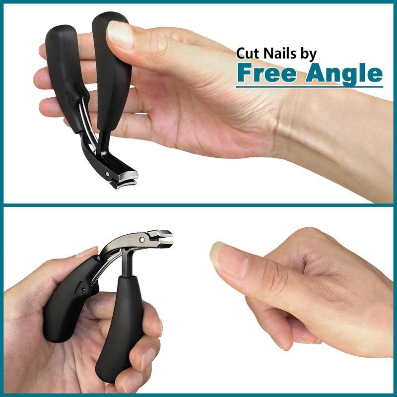 - 【New Curved Head Design】 The new bent head design of this toe nail cutter for seniors hard to reach, makes you to easily cut toenails and fingernails; You don't need to bend down too much, and its angle increases your field of vision, making it more convenient and confident to cut; This nail clippers are perfect for cut thick or ingrown toenails or irregular nails,and play a supporting role for ingrown toenail treatment;