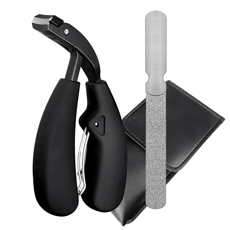 This nail clipper is different from other nail clippers of the same type on the market, it has a new curved head design that allows you to cut fingernail & toenail with ease,good for thick/ingrown toenail treatment or good pedicure tools for feet; It's ergonomic meaning you don't have to curl your feet up but instead your foot remains on the floor and when you pressed the handles to cut, it's easy; It is perfect for cutting thick ingrown toenails or irregular nails to prevent cracking of the nails; its curved blade is sturdy and sharp curved blade made of surgical grade 30Cr13 Stainless steel, high precision, easy to use, rust-proof, waterproof and durable; The handle is made of ABS blended rubber, comfortable and non-slip, lighter and easy to maneuver; you can see the edge of the blades and nails more clearly with the tilted head design and can quickly complete your cutting work; and comes with a one-piece catcher that prevents nails from splattering during the nail cutting process. Perfect for men, women, seniors, joint pain, muscle pain, and people with limited dexterity/motor skills. It makes a great gift for family and friends for Christmas, birthdays, Mother's Day, Father's Day, Thanksgiving and Memorial Day. You will receive a nail clipper, a double sided 180 diamond grit file and an exquisite PU leather bag.