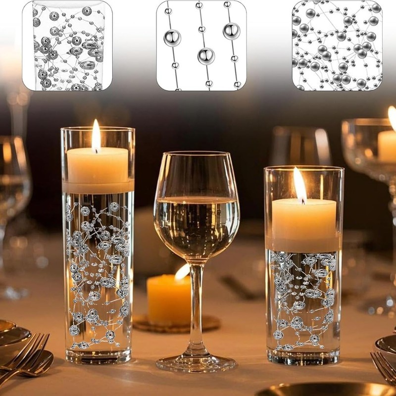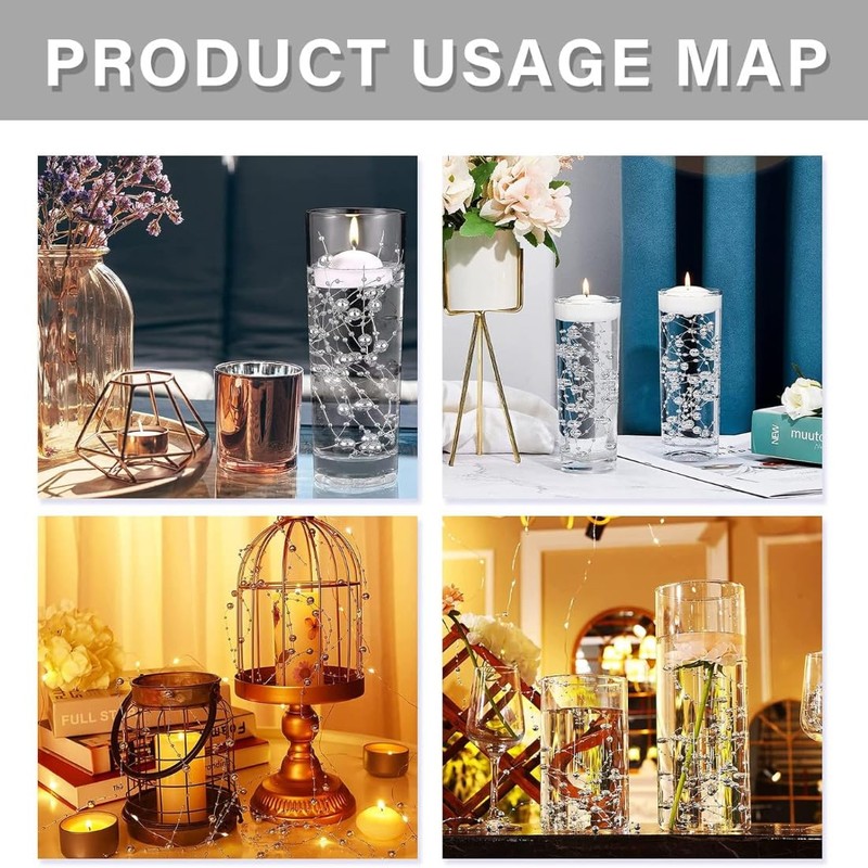 Easy to use: simply insert the water candle vase filling beads into the vase and pour water; after the transparent gel beads expand, you can put the artificial pearl cords in the vase, light the candles, and you can get delicate and beautiful table decorations, easy and convenient!
