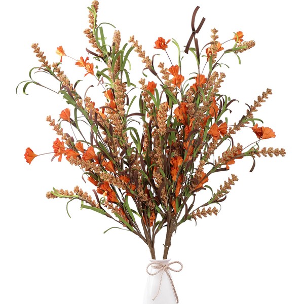 - [SIZE & PACKAGE]: The floral arrangement height is approx 25.5inch inch in total. The stems have been bend into half due to transportation,please adjust the leaves and stems into original shape. The package includes diverse of flower elements,such as artificial grain,wild orange flowers and foam green leaves (vase is not included), which is a proper size and quantity to fit your vase.