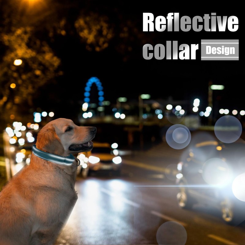 - Reflective collar, Visibility is insane when there is a light source, reflective collar that extends adventure into low-light condition