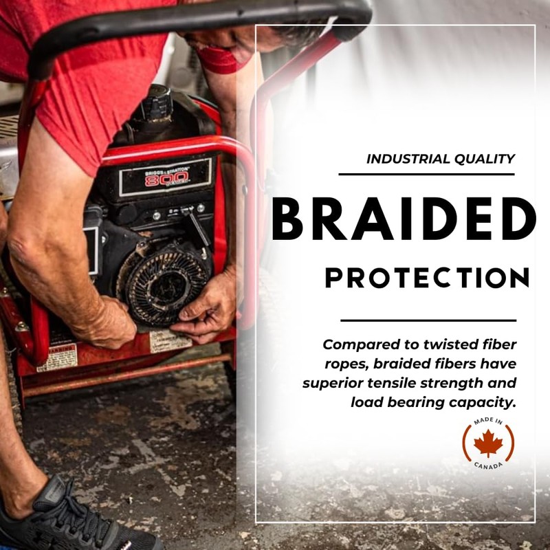 • BRAIDED PROTECTION - Our small engine starter rope is built using a solid braid technique to increase abrasion resistance and minimize stretch. The interlocking strands of polyester fibers will lock firmly into place, keeping the rope taut during every pull. Compared to twisted fiber ropes, braided fibers have superior tensile strength and load bearing capacity.