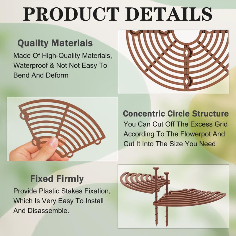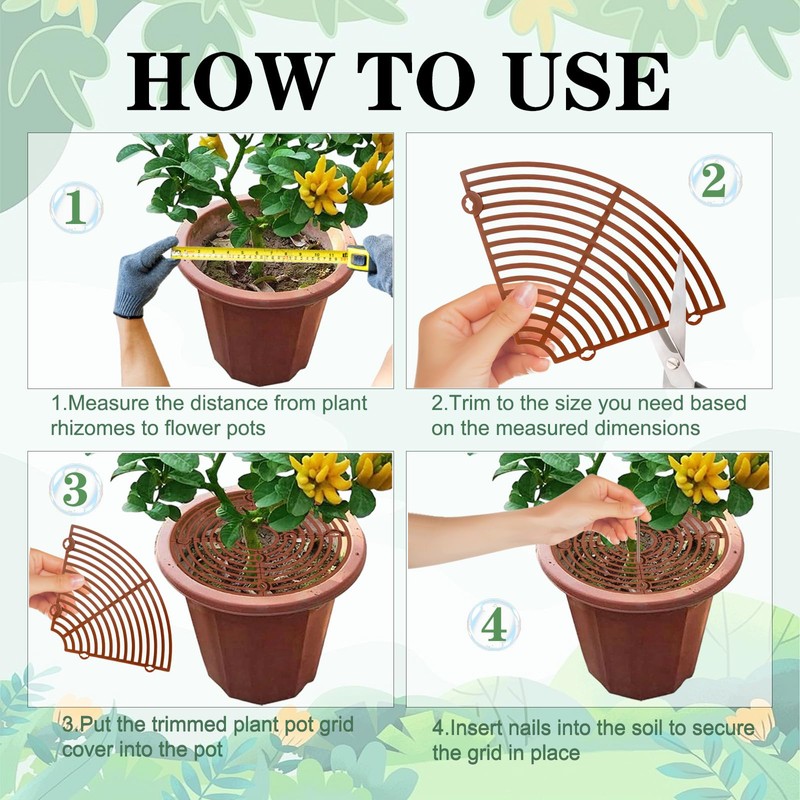 - 5.How to Use: firstly, measure the diameter of your pot and the size of the plant roots, then cut the right size of the grid pot cover accordingly, finally, put the indoor plant pot covers into the pot and fix them with the provided plastic stakes, very easy to install and remove.