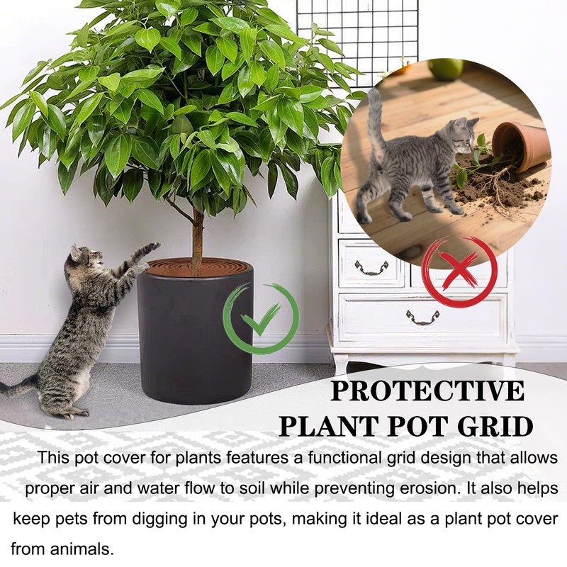 - 3. Protective Plant Pot Grid: This pot cover for plants features a functional grid design that allows proper air and water flow to soil while preventing erosion. It also helps keep pets from digging in your pots, making it ideal as a plant pot cover from animals.