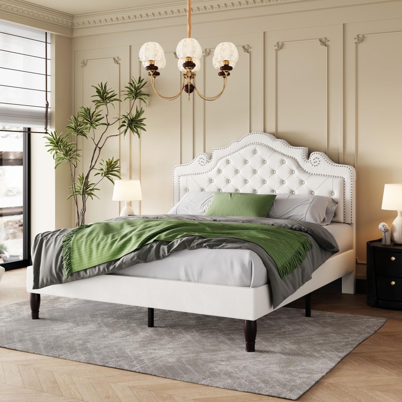 SHA CERLIN Queen Size Bed Frame with Adjustable Headboard/Velvet Upholstered/Diamond Button Tufted and Metal Studs/No Box Spring Needed/Sturdy Wood Slat Support/Easy Assembly/White