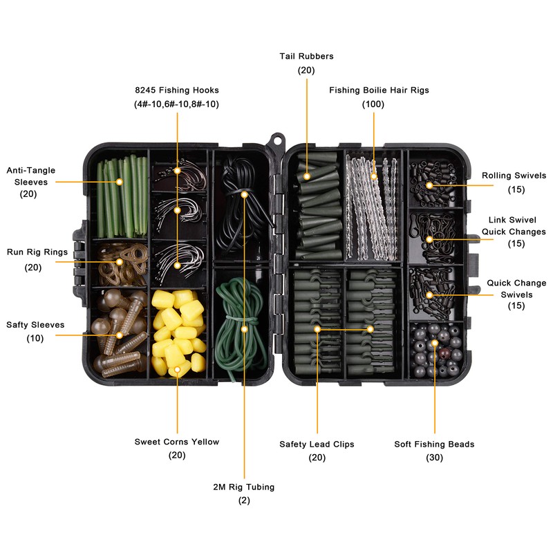 - 307 piece accessory kit for carp fishing, perfect for pulley rigs, portland rigs and running ledgers.