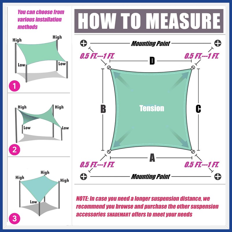 - Custom Size: we have a large selection of custom sized shade sails to meet all your requirements, please measure your venue accurately before purchasing; Shade sails may vary due to manual measurements, but the area of the fabric is constant