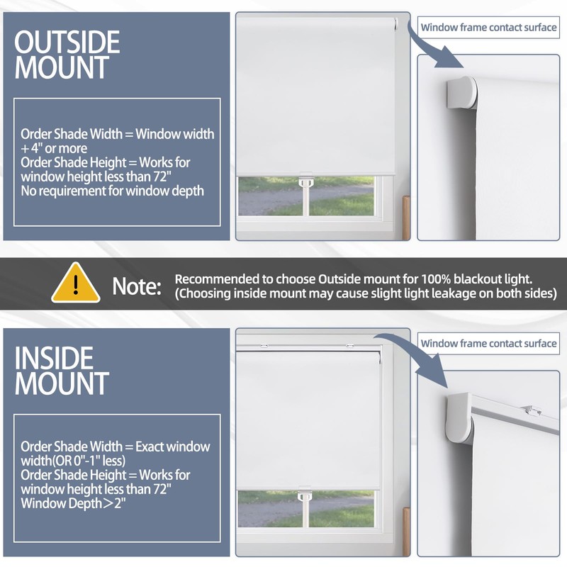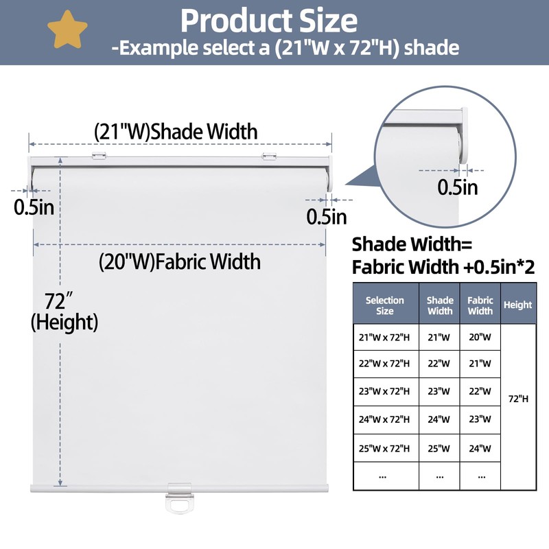 - Order Size:To ensure full window coverage, outside mount shades should be 4 inches wider than the window width. For example, if your window is 34" width, order a 38" shade for an outside mount. For inside mount, if your window is 34" wide, order a 34" shade or slightly smaller, window depth >2". The window blind height can be adjusted from 0" to 72".(Please Note):The fabric width will be 1" narrower than the total shade size.