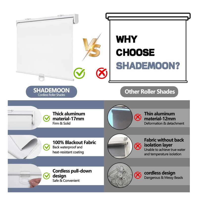 - Fabric Functions:Our roller shades made of 100% blackout 3 pass fabric coated with white backing, feeling soft and smooth.It can blocks out 100% sunlight. The thermal insulated backing can reduce room heat and cold loss through window during winter and summer, helping cut your energy bills. It also works well in noise reducing and privacy protection. Great for bedroom, living room, bathroom, kitchen, French door and office.
