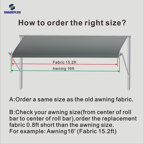 - HOW TO CHOOSE RIGHT SIZE:To ensure the correct awning fabric replacement size for your RV, camper, or motorhome, please carefully measure the distance between the center line of the two awning arms before making a purchase.Actual finished awning fabric measurement of 17'2" is fit for 18' RV Awning