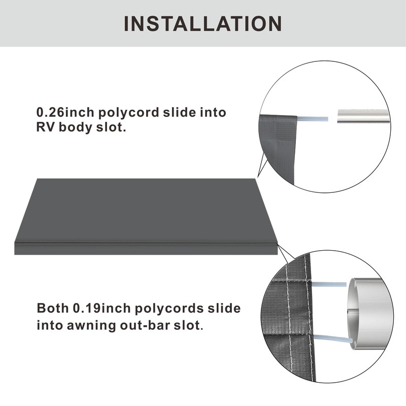 - EASY TO INSTALL:Easy installation with no tools required. Simply slide the three sewn-in polycords on the awning fabric into their respective RV awing guide rail, and the RV awning fabric will be securely in place.