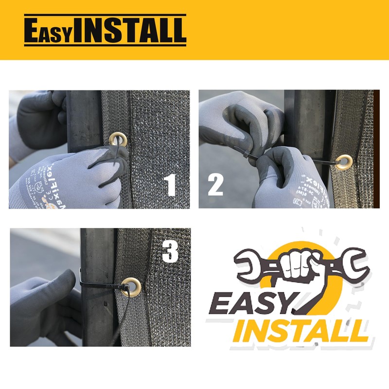 - This product is easy to install. Use included zip ties to fasten the grommets to the fence on each side. There are double stitch black binding and grommets on each side.
