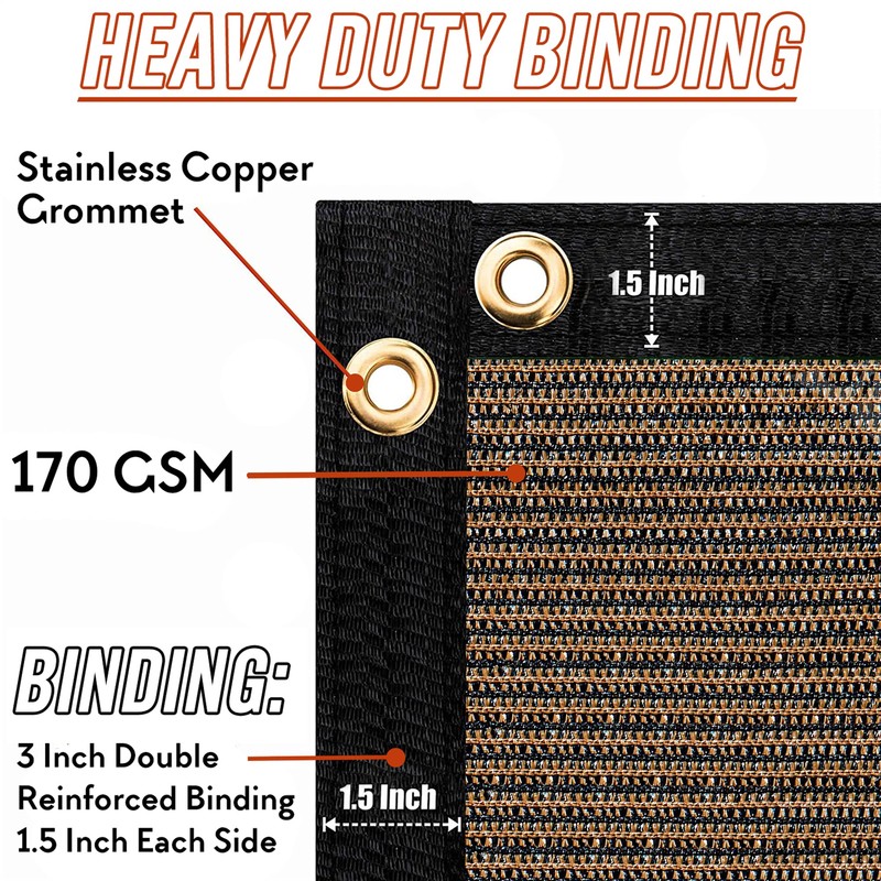 • Installation of this product is simple. The grommets can be fastened onto the fence by using included zip ties. Grommets are located on each side and the binding is double stitched in black color