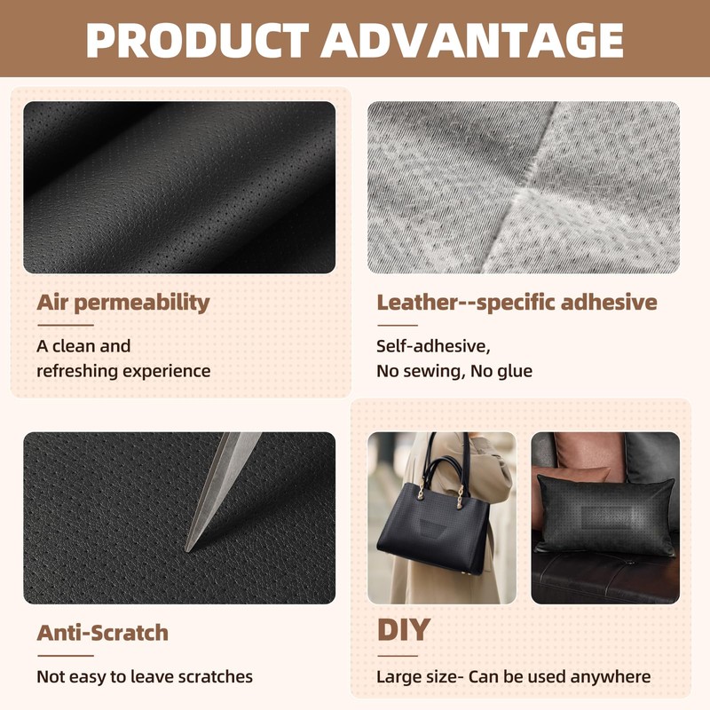 - Excellent Product: Large leather tape is easy to use, because it is much wider than most of the other leather reupholstering patches. Adhesive leather film is scratch-resistant, waterproof and easy to scrub.
