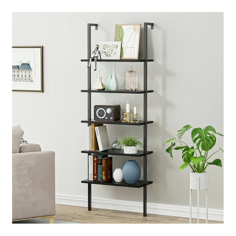 Shahoo Ladder Shelf, 5-Tier Bookshelf with Metal Frame, Open Display Organizer Rack, Wood Wall Mounted, Storage Shelves for Living Room, Hallway, Office, Black(2 Pieces)