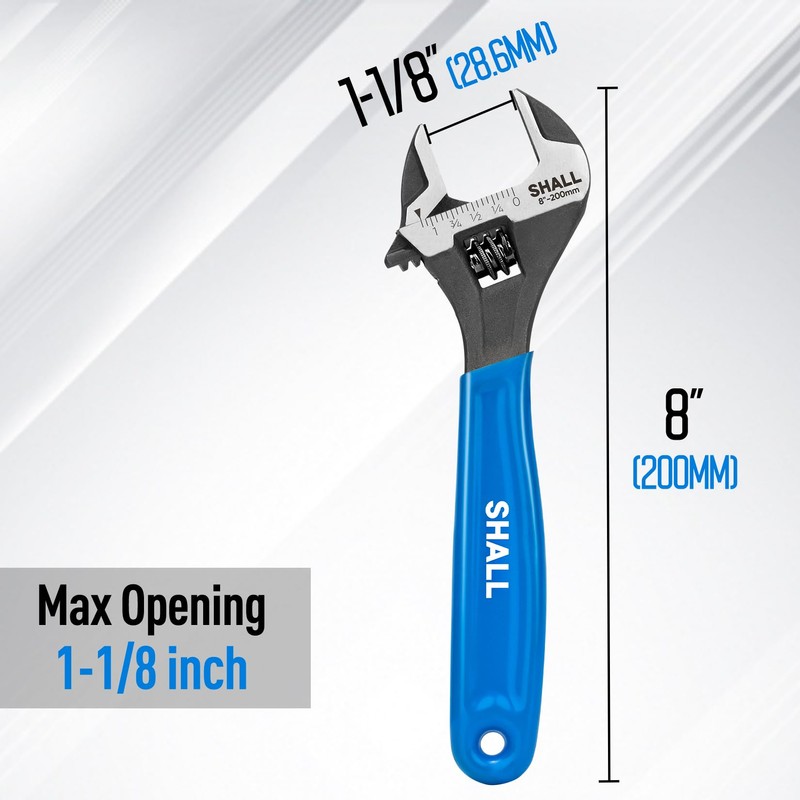 - Wide Jaw Design: The wide jaw design allows the user to use the adjustable wrench more efficiently; 8" max opening 1-1/8"