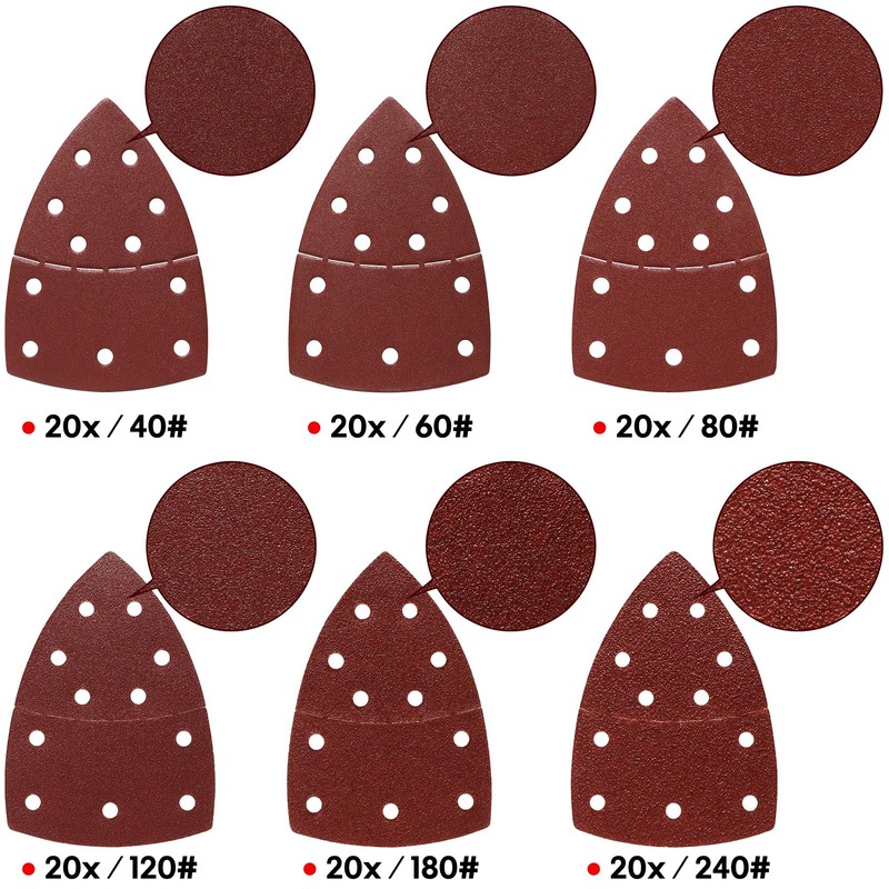 - Comprehensive Set: This sandpaper is suitable for all oscillating multi-tools and sanders and comes with 20 sheets of each grit in 40, 60, 80, 120, 180, 240#, total 120 sheets. From coarse to fine, meet your needs