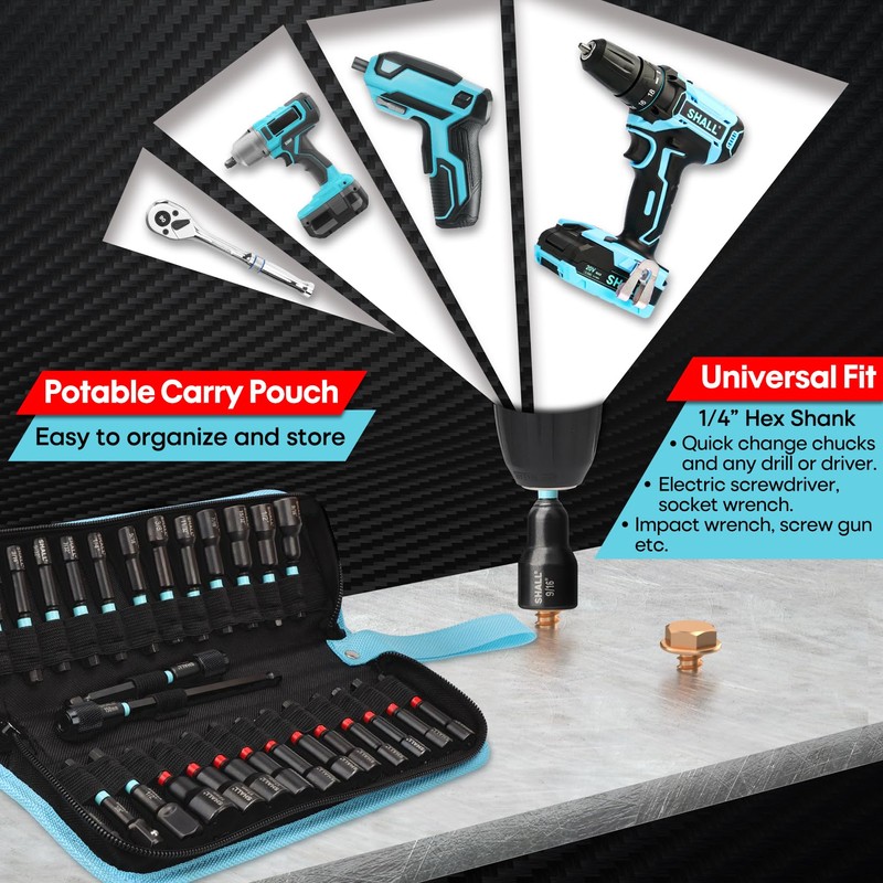 - Universal Fit: The nut setter master set owns a universal 1/4" hex shank for quick chucks and any drill or driver, electric screwdriver, socket wrench, pneumatic impact wrench, cordless electric drill, screw gun, etc