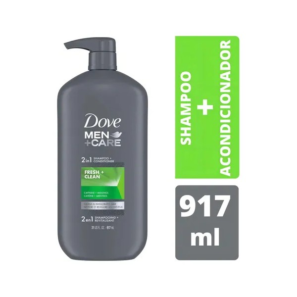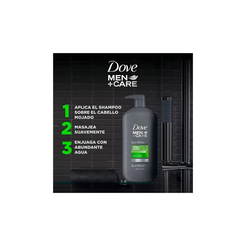 Shampoo + Acondicionador 2 en 1 Dove Men +Care Fresh+Clean con cafeína más menthol. Limpia profundamente y tonifica tu cabello dejando un efecto refrescante duradero. Limpia, tonifica, refresca y deja tu cabello manejable.