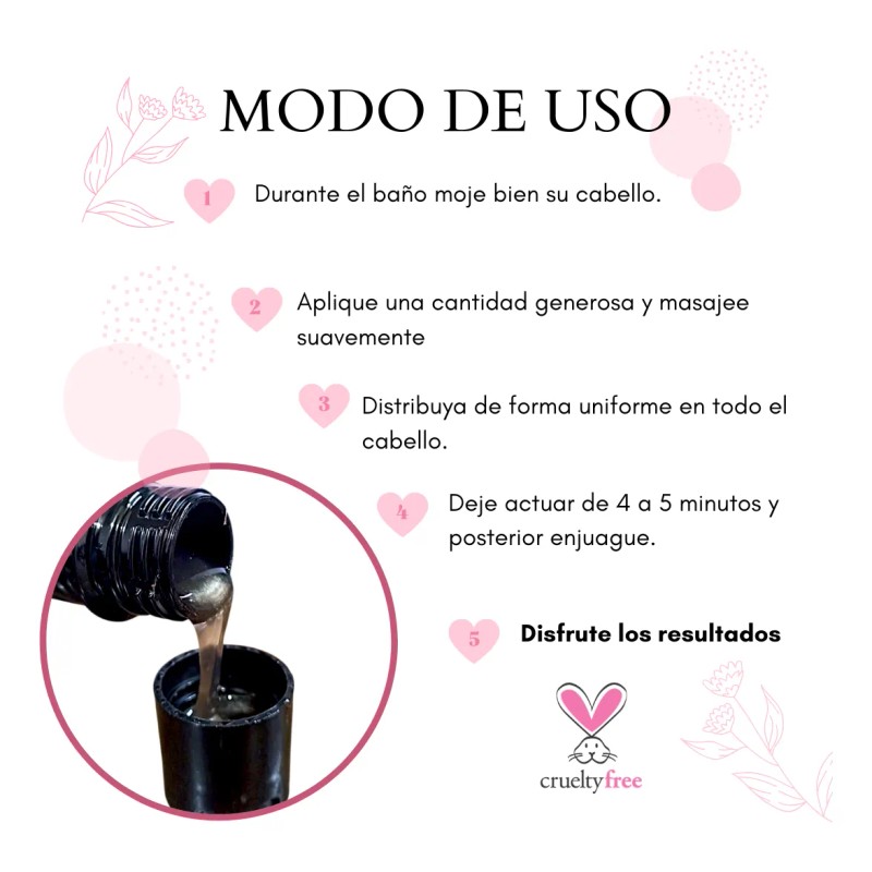 Durante el baño moje bien su cabello y aplique una cantidad generosa y masajee suavemente, distribuya de forma uniforme en todo el cabello. Deje actuar de 4 a 5 minutos y posterior enjuague.