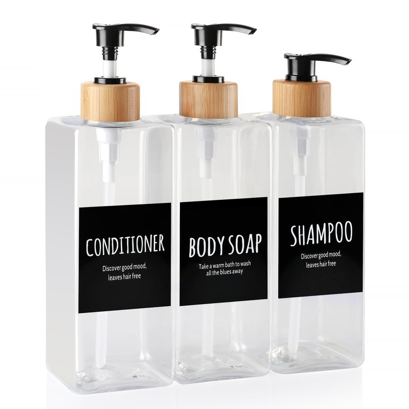 - Multi-function waterproof label:Each set of shower dispenser contains 3 bamboo wood pump head bottles.Each set of refillable shampoo and conditioner bottles is equipped with 3 waterproof labels for clearly identifying the contents, including body wash, shampoo, conditioner , These labels are waterproof and durable,