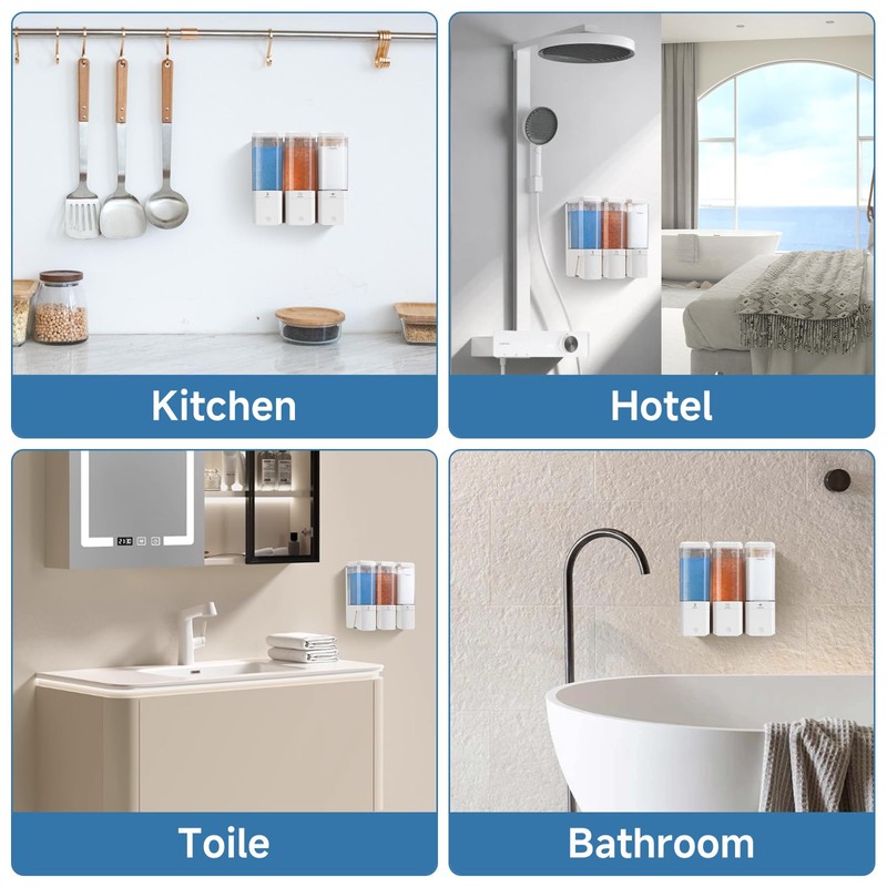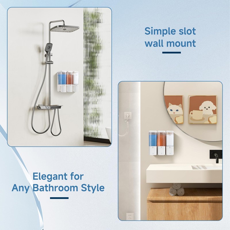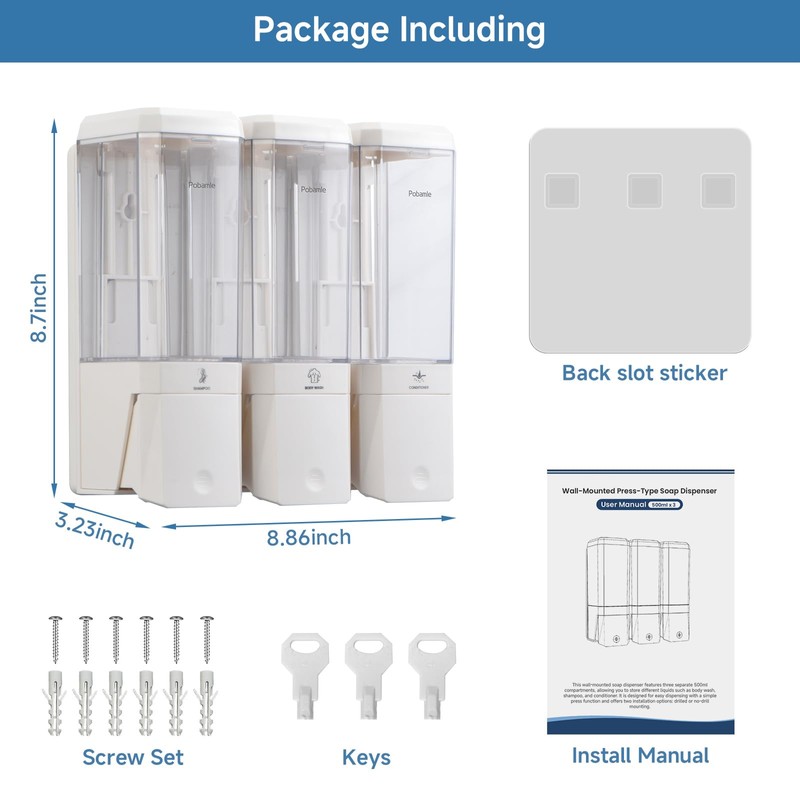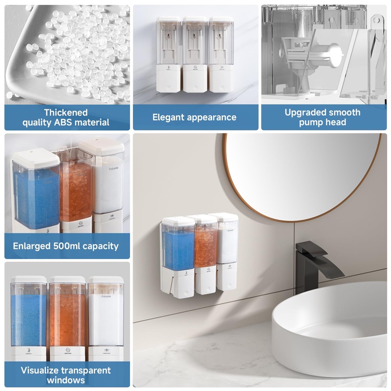 - 🌲LESS CLUTTER - Pobamle's wall mount 3 in 1 shower soap dispenser perfectly organizes your shampoo, conditioner, body wash, or whatever else you need to enhance your bathing emotion, with multiple liquids at your fingertips