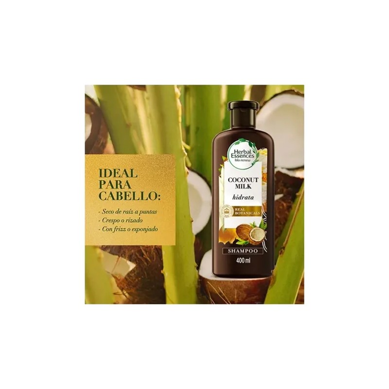 Las mujeres polinesias atribuyen el increíble brillo de su cabello al poder de la leche de coco. Se cree que esta mágico ingrediente le da brillo, fuerza y salud al pelo. El Shampoo Herbal Essences Leche de Coco ayuda a que tu pelo huela bien y se sienta bien. Este shampoo contiene Leche de Coco real, certificada por los expertos en plantas del Jardín Botánico Real, Kew en Londres.