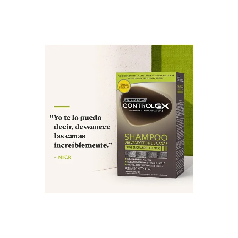 Descubre el Shampoo Just for Men Control GX, un shampoo especial que reduce gradualmente las canas, proporcionando un aspecto natural. Este producto no solo cubre las canas, sino que también nutre y revitaliza las fibras capilares, dejándolo brillante y saludable. Úsalo como sustituto de tu shampoo regular hasta alcanzar el resultado deseado, y luego alterna con tu shampoo convencional para mantener un aspecto auténtico. Este shampoo tinte para hombres ofrece una limpieza suave, aumentando el volumen y la textura del cabello. Adecuado para diferentes tonos de cabello, excepto cabellos decolorados o con mechas claras. Realiza una prueba de alergia antes de usar y suspende en caso de reacción. Recuerda mantenerlo fuera del alcance de los niños y evita el contacto con los ojos.