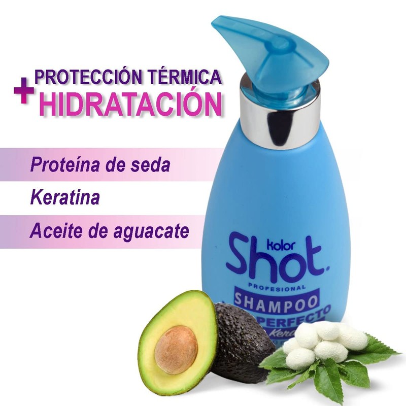 Shampoo Liso Perfecto Kolor Shot con Keratina sin Parabenos, Hidrata y Suaviza el Cabello proporcionando Brillo y Sedosidad, Disminuye Efectivamente el Frizz 250ml.