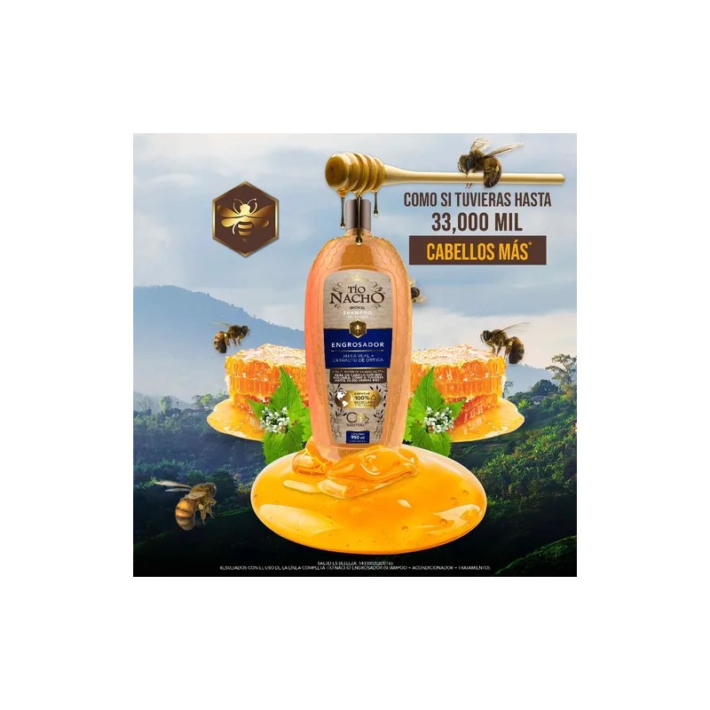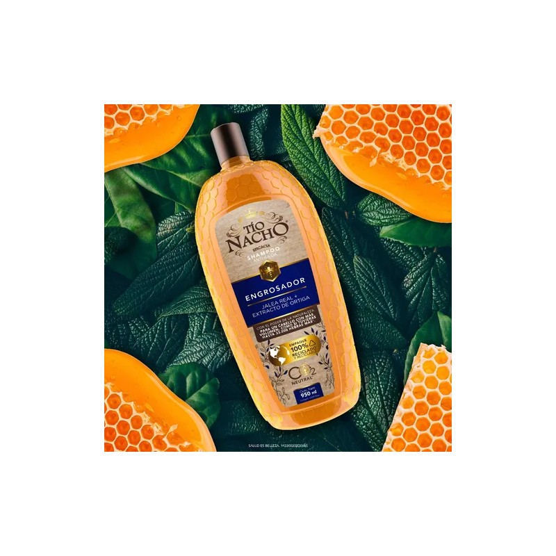 Tío Nacho renueva su imagen para brindarte un Cabello y Planeta más saludable. ¿Cansado de tener un cabello quebradizo y sin volumen? Prueba TÍO NACHO ENGROSADOR, la combinación perfecta de JALEA REAL con ingredientes de origen natural, como extracto de ORTIGA, GINSENG, QUINA, ALOE VERA y LÚPULO que ENGROSAN y FORTALECEN cada fibra capilar. Siente tu cabello MÁS FUERTE y con MÁS VOLUMEN. Nuevo empaque 100% reciclado y reciclable.