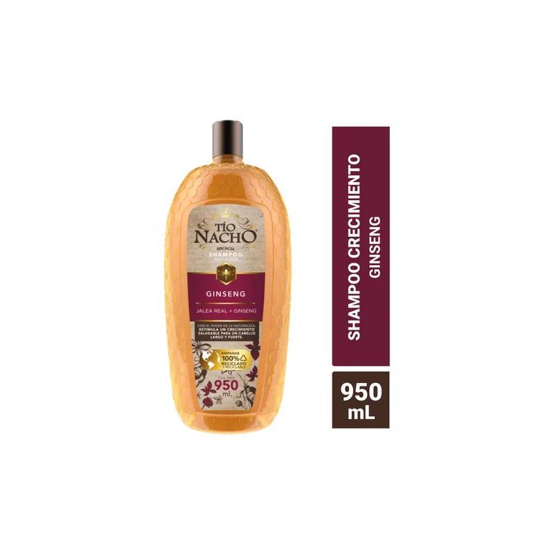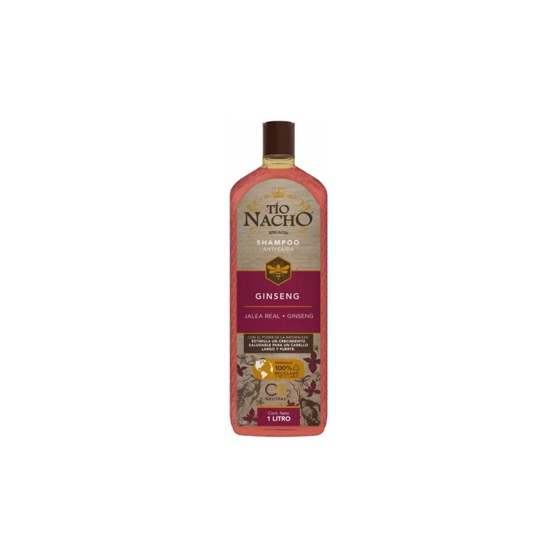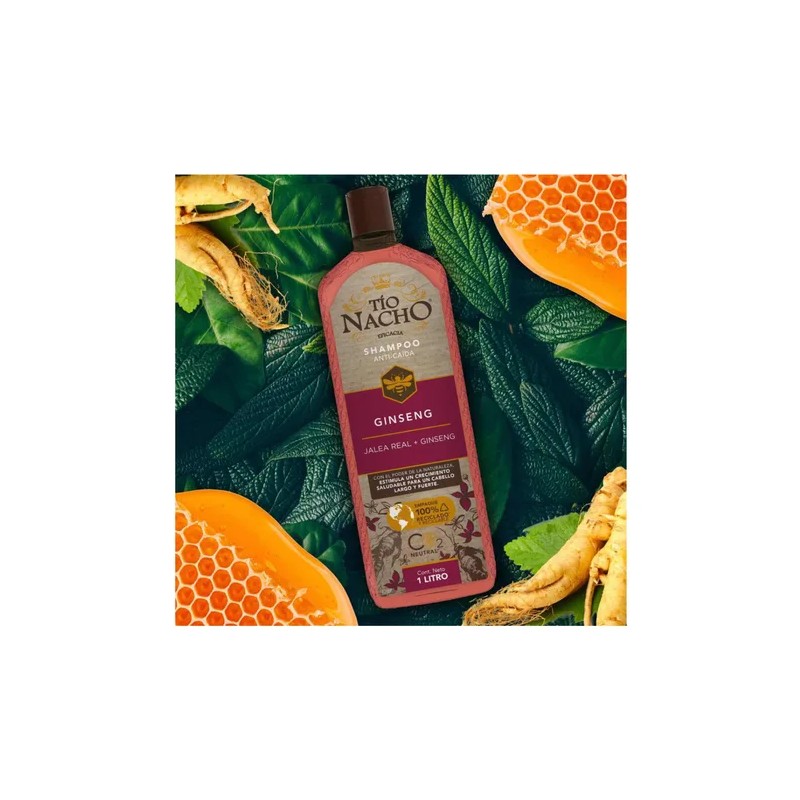 Tío Nacho renueva su imagen para brindarte un Cabello y Planeta más saludable. Tío Nacho ANTICAÍDA GINSENG revitaliza la fibra capilar para un CRECIMIENTO saludable, un cabello más LARGO y FUERTE, aun en situación de caída por quiebre, dejándolo con cuerpo y sedosidad. Actúa eficazmente sobre el cuero cabelludo y fibra capilar mientras su fórmula con JALEA REAL, adicionada con extractos de origen natural como GINSENG, ALOE VERA, ROMERO y JOJOBA estimulando el crecimiento saludable.