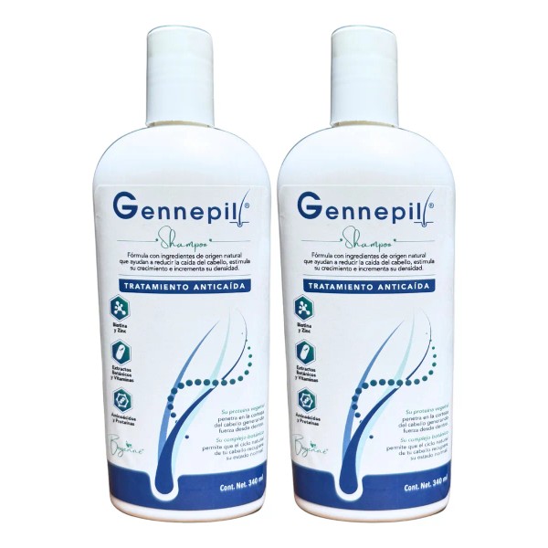 shampoo anticaída gennepil tratamiento caída cabello méxico, shampoo fortalecedor para crecimiento capilar hombres mujeres, shampoo gennepil pack 2 piezas caída excesiva, shampoo para cabello delgado débil con poco volumen, tratamiento shampoo anticaída uso diario gennepil.